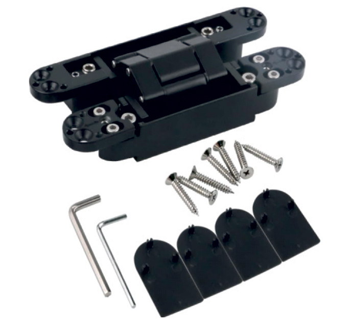 Concealed 3D door hinge is a high-performance hidden hinge that allows for 3 dimensional adjustment, creating a flush, gap-free finish for interior and exterior doors. Available in different finishes (Silver, Black, Antique and Matt Gold) with 3 different load capacity of 40kg (CDH-40) , 80 kg (CDH-80) & 120kg (CDH-120)